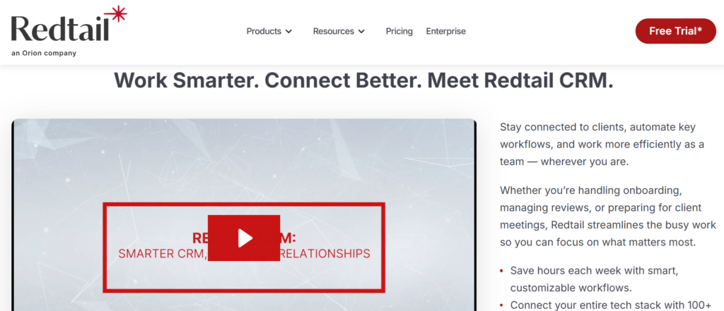 - Redtail CRM: A highly customisable CRM with robust integrations, suitable for mid-sized to large advisory firms needing comprehensive client management and reporting features.