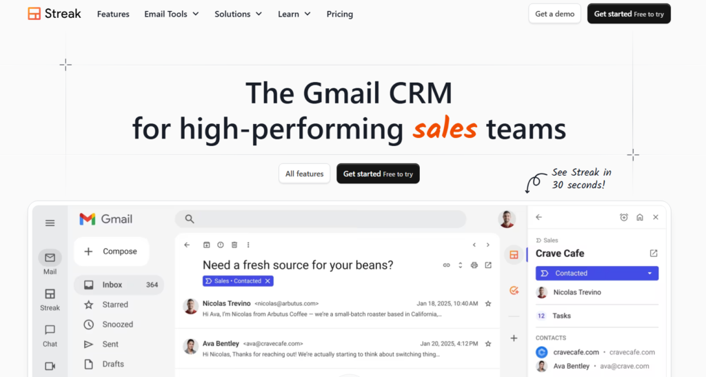 Streak CRM fits UK startups that want light tracking without leaving Gmail.