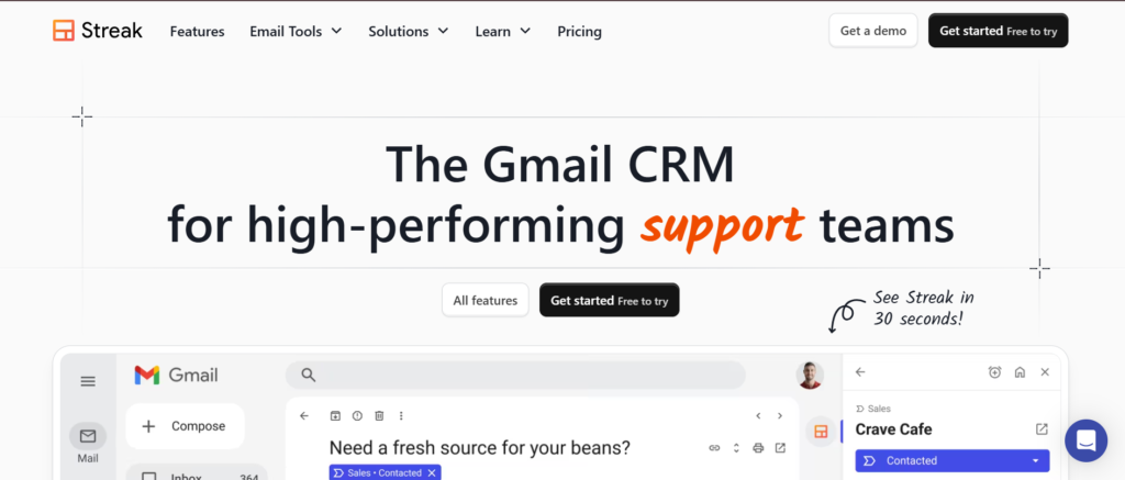 | Streak CRM | Gmail-based users, small teams | Gmail integration, lead tracking, progress management | Free for basic, £15/user/month (paid) | 4.2/5 |