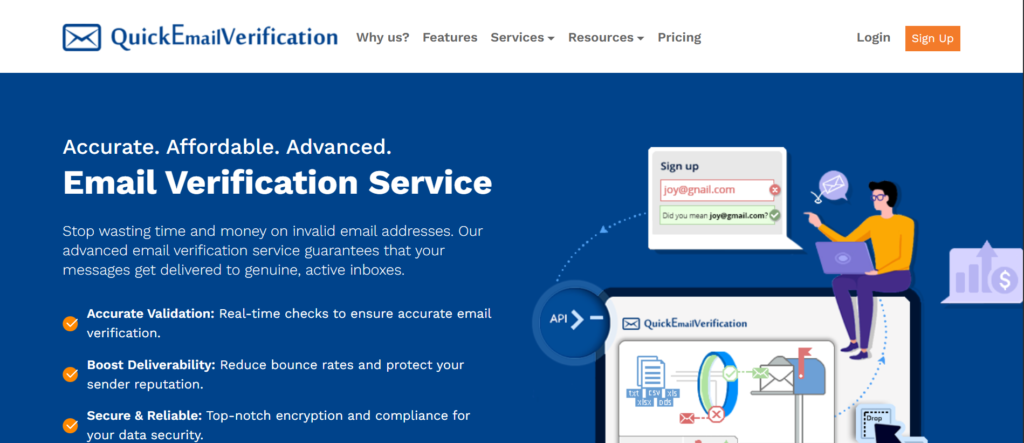 QuickEmailVerification is built specifically with outbound sales workflows in mind. It is frequently used by SDR teams and agencies running cold email campaigns that need a balance between speed, accuracy, and sales tool compatibility. The platform focuses on preparing lists for outreach rather than general database maintenance.