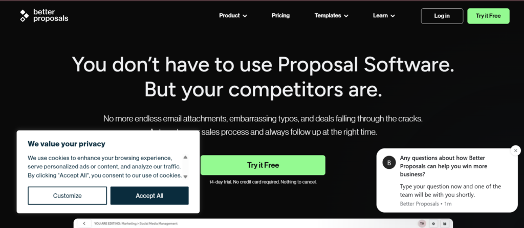 | Better Proposals | Quick setup | $19 per user pm | Yes | Template marketplace | Yes |