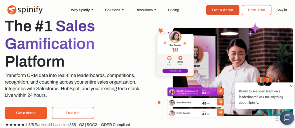 Spinify is widely recognised as one of the best sales gamification platforms for companies that want to create visible competition inside their sales teams. The platform focuses heavily on live leaderboards, competitions, and performance tracking to maintain consistent motivation across representatives.