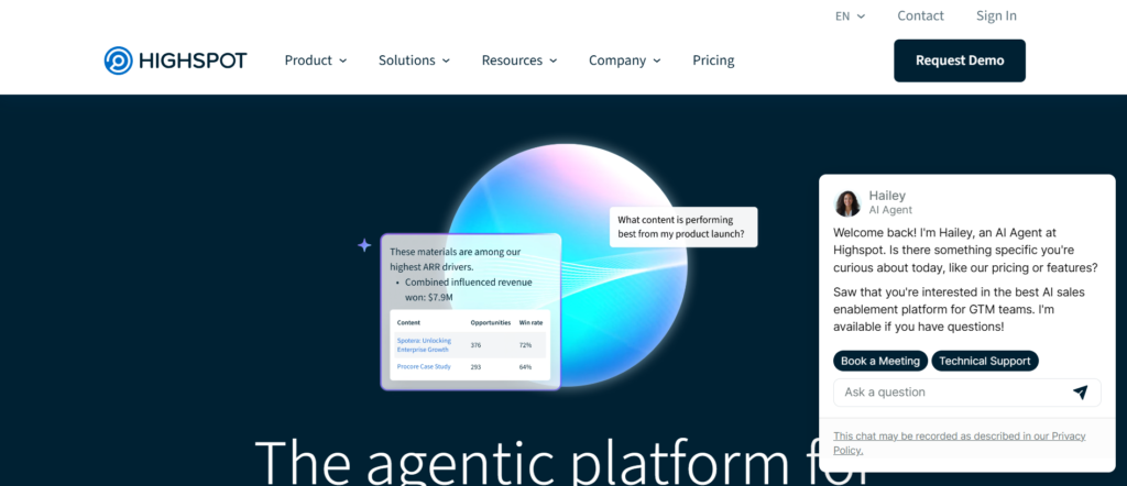Highspot is widely recognised as one of the Best Sales Playbook Software platforms for enterprise sales teams that want structured deal guidance and organised sales content. The platform combines sales playbooks, training materials, and sales content management in a single system that supports both onboarding and active deal execution.