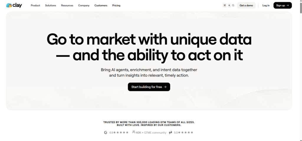 Clay connects with CRMs, data tools, and outreach platforms, supporting end-to-end data movement.